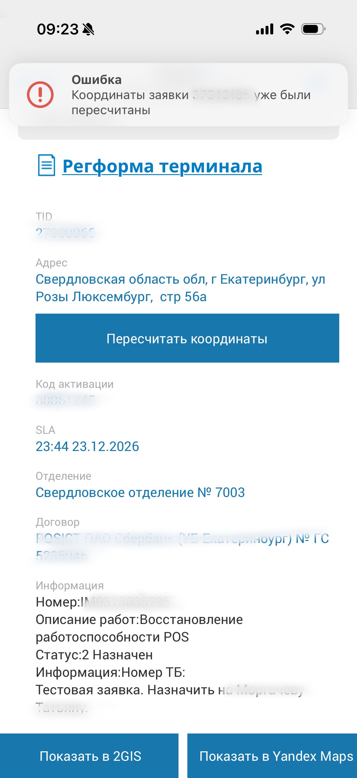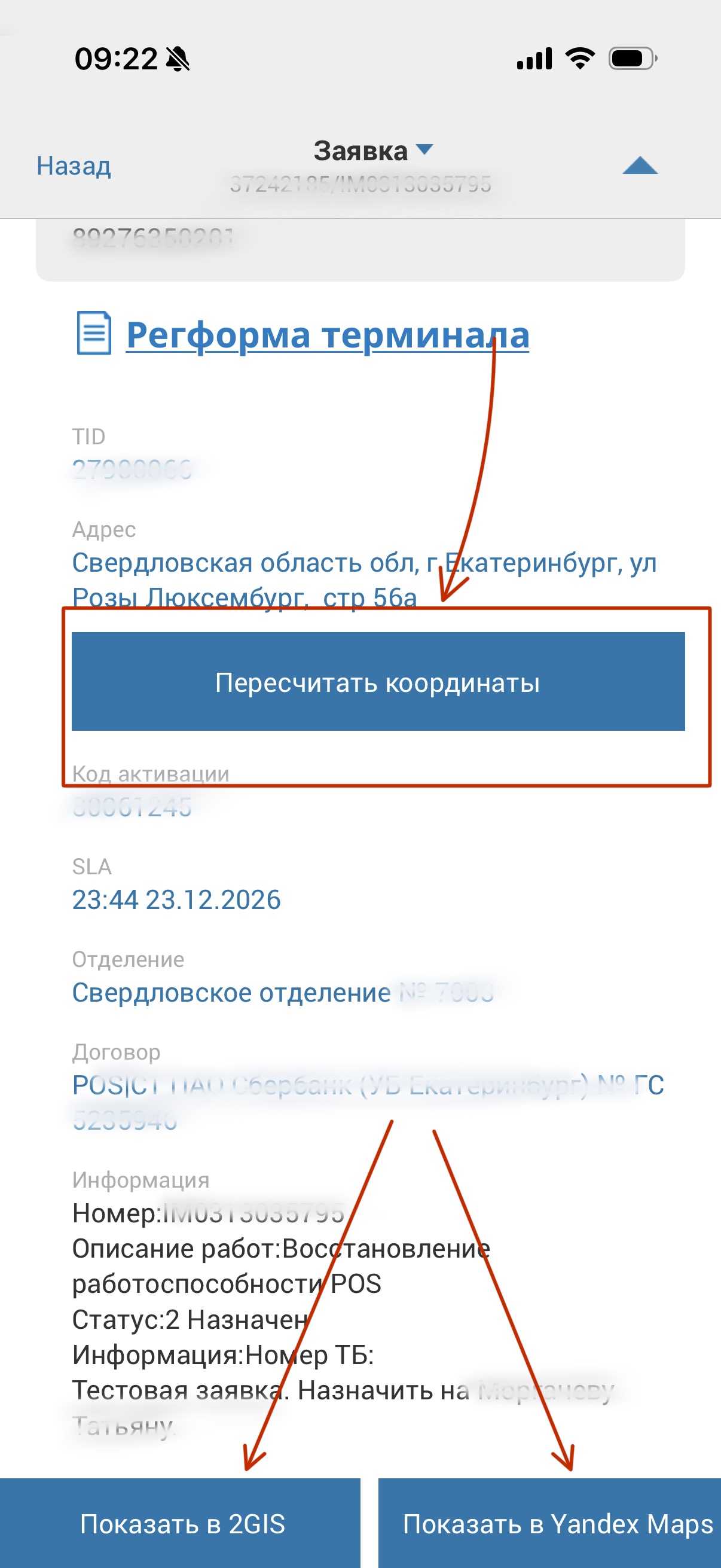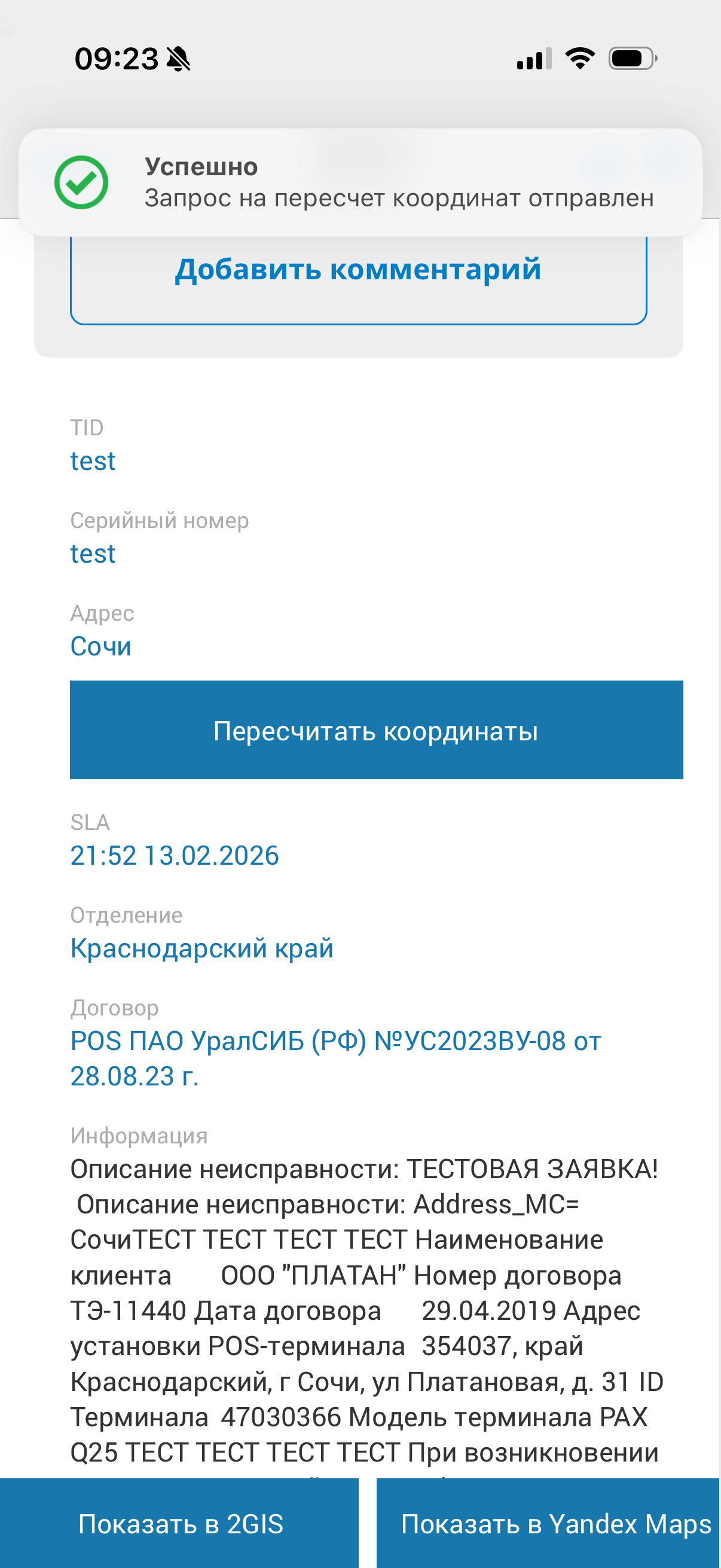 Если пользователь при переходе на карту видит, что координаты на карте не совпадают с адресом из заявки, то необходимо направить запрос на изменение координат.
